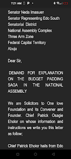 In light of the budget padding saga that has shaken the National Assembly, Chief Dr. Eholor's recent actions have been particularly noteworthy. Through a letter penned by his counsel and addressed to Senator Neda Imasuen, representing Edo South Senatorial District, Chief Dr. Eholor sought clarification on the senator's role in the alleged scandal. It's crucial to emphasize that Chief Dr. Eholor's inquiry is not an indictment of Senator Imasuen's character but rather a principled call for transparency and accountability in governance.